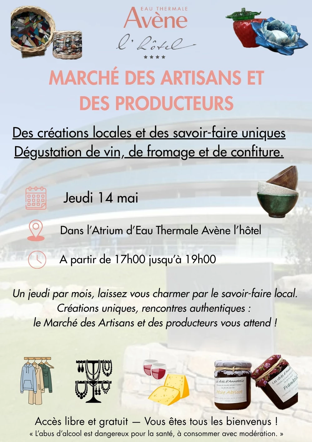 - Moment convivial et d’informations de 17h à 19h : présentation du Centre Thermal Avène, de eau Thermale Avène l’hôtel et de l’office de Tourisme Grand Orb. Gratuit et ouvert à tous, information 04.67.23.44.45