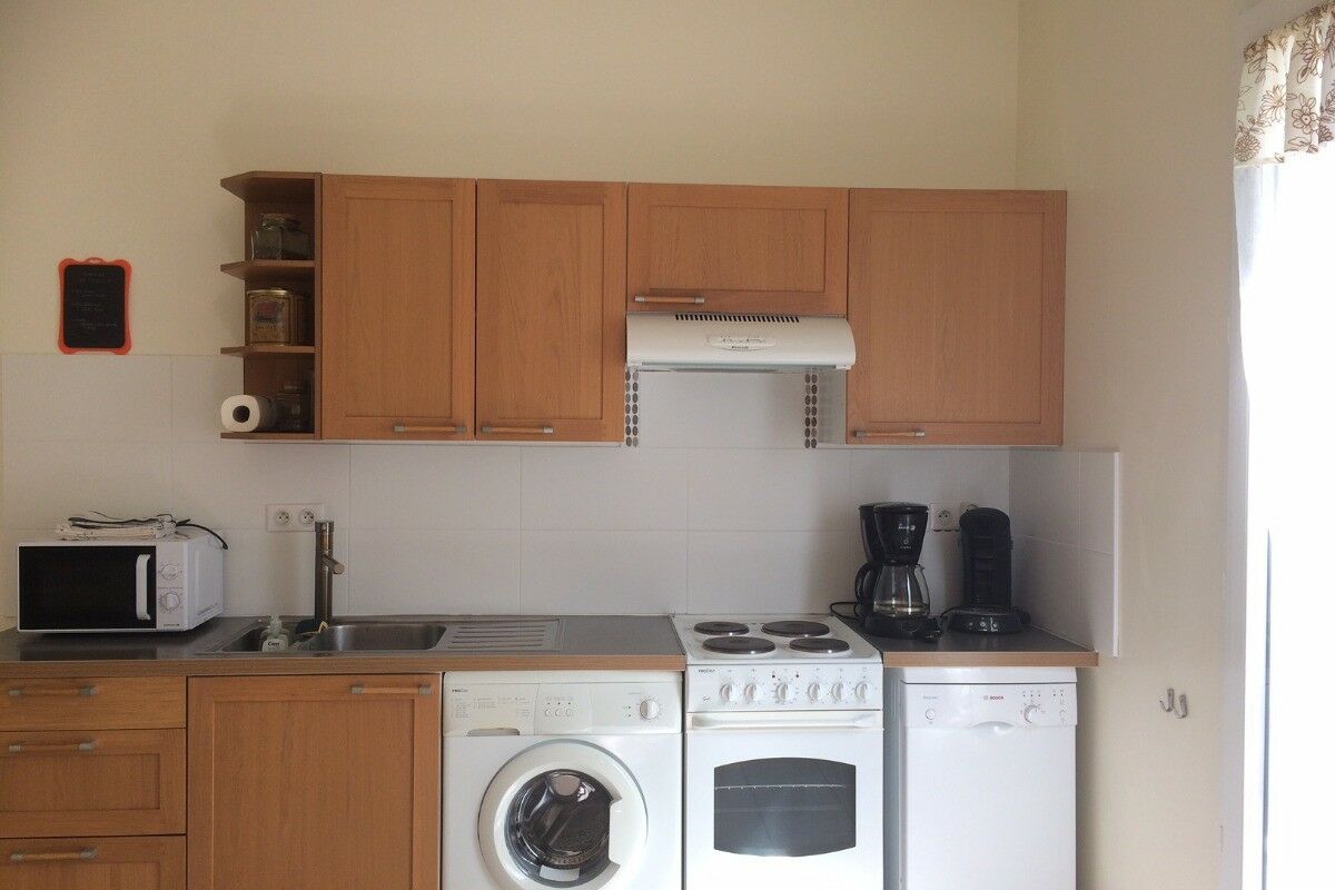 L'espace cuisine est entièrement équipé : réfrigérateur, congélateur, four, micro-ondes, lave-linge, et lave-vaisselle, pour un confort optimal.