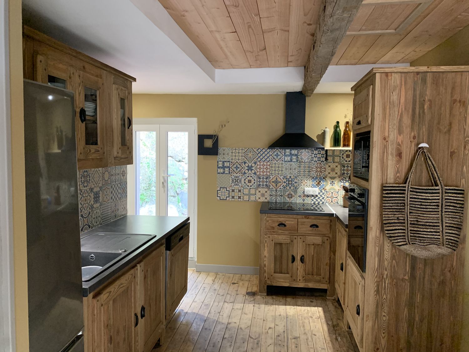 La jolie terrasse de 12m2 adossée à la montagne à l'arrière de la maison est accessible de la cuisine.