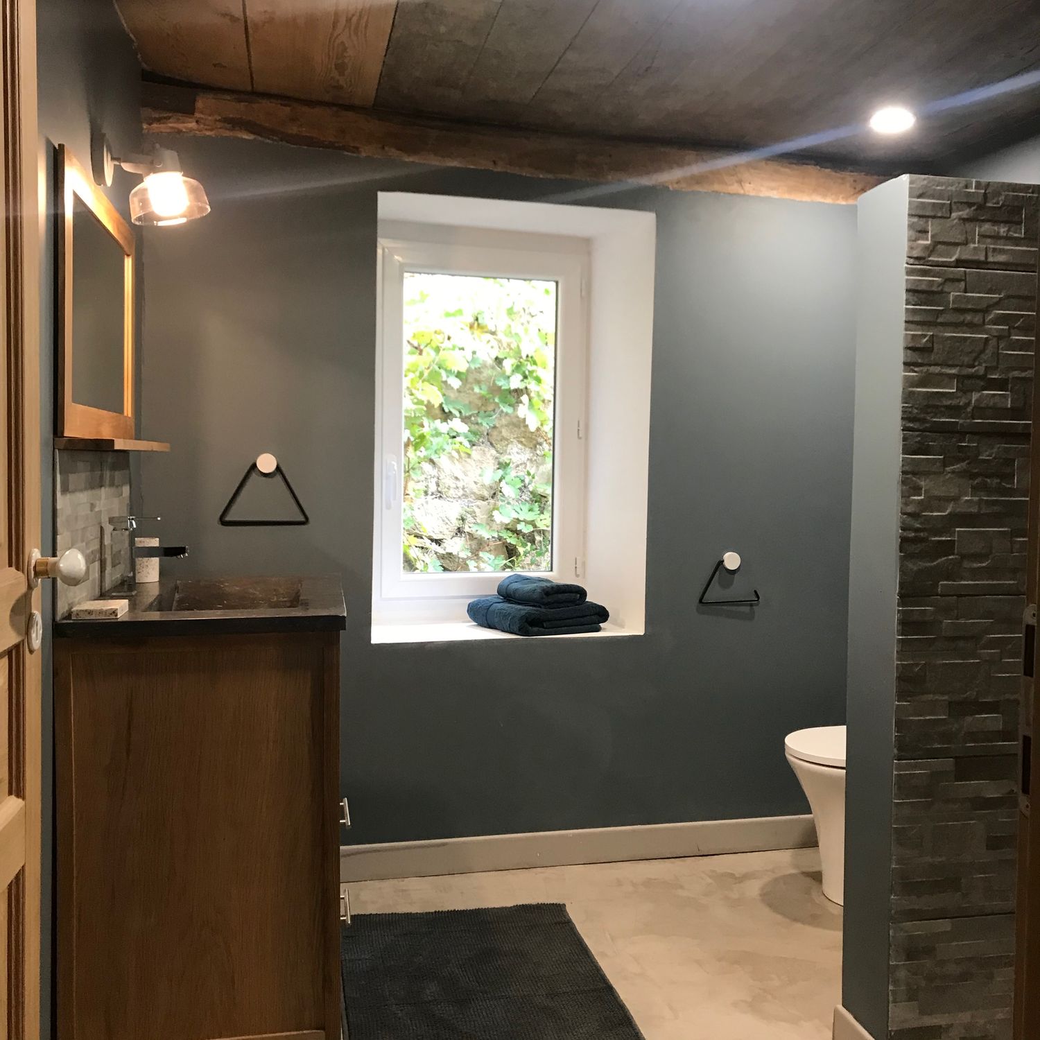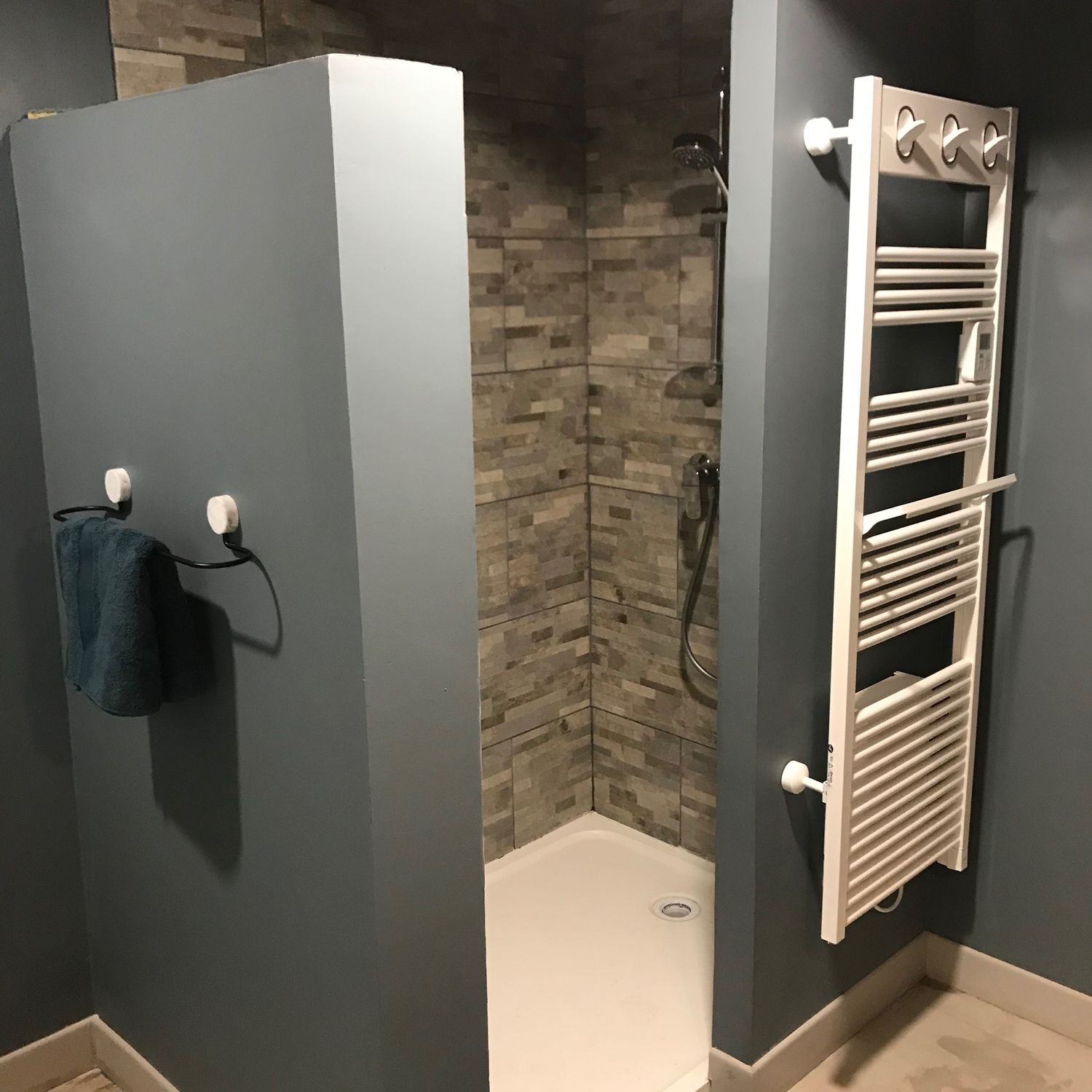 La salle de bain accessible de la chambre bleue possède une vasque avec douche spacieuse, WC, radiateur, sèche serviette soufflant.