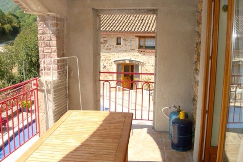A l'étage espace cuisine bien équipée : frigo/congélateur, four, micro-ondes, lave-linge, lave-vaisselle, avec accès à un grand balcon donnant sur la piscine.