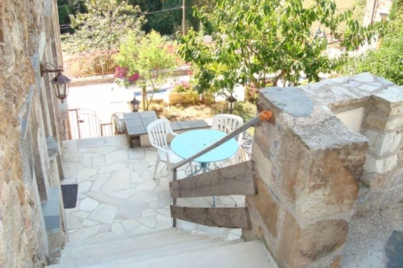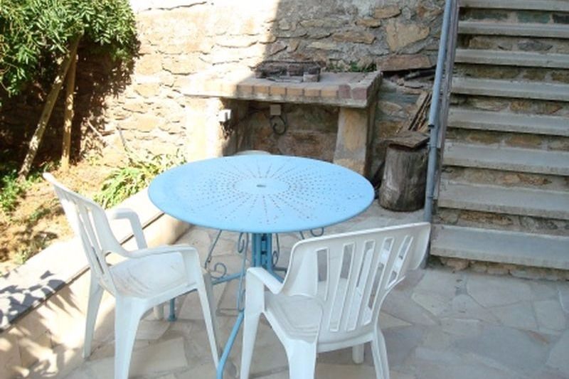 Terrasse devant l'entrée avec salon de jardin et barbecue.