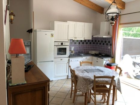 Cuisine ouverte bien équipée : frigo/congélateur, four, micro-ondes, lave-linge, lave-vaisselle.