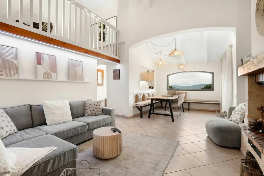 - Salon de 35 m² avec canapé, télévision, cheminée et coin repas
