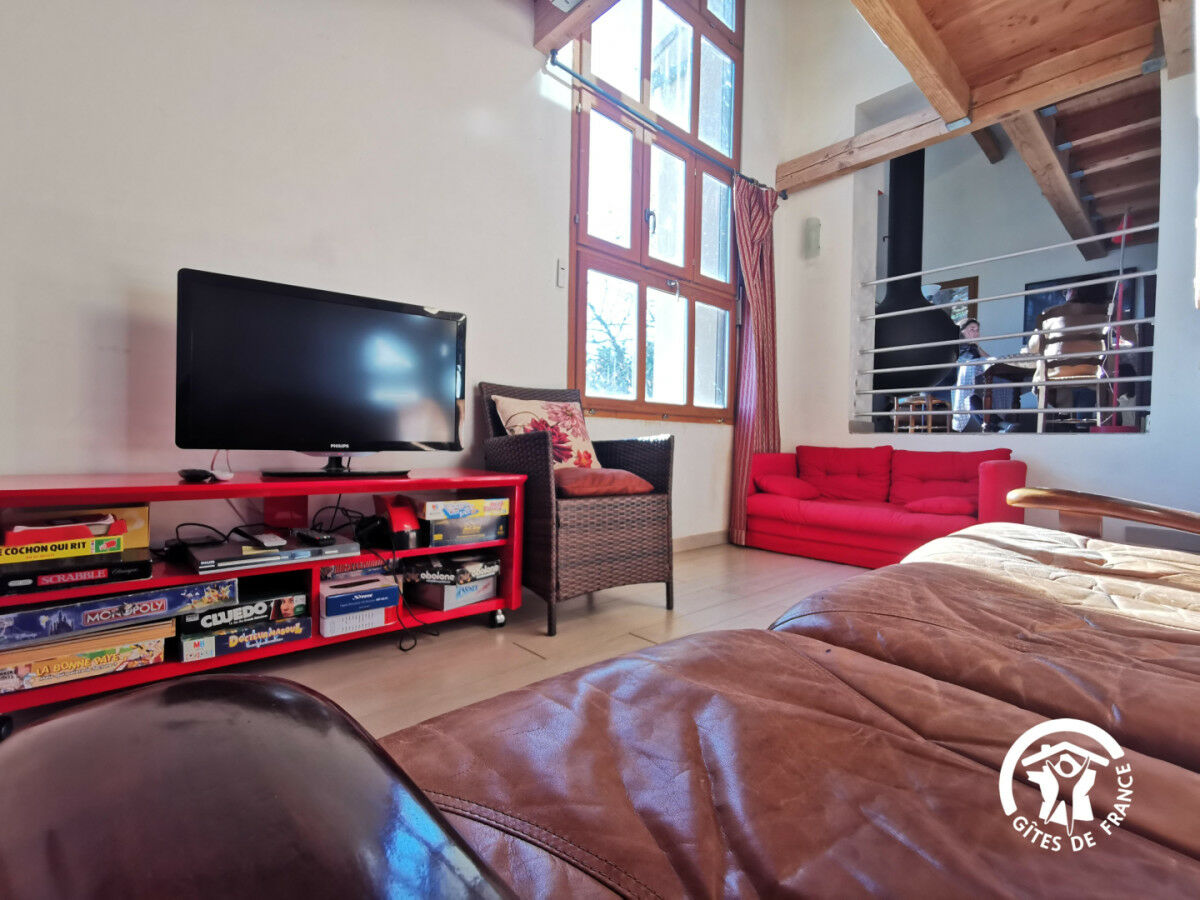 Vous descendrez quelques marches pour arriver au coin salon avec TV et à la chambre avec un lit double (160x200) . A l'étage, une deuxième chambre avec deux lits simples convertibles en lit double (180x200).
