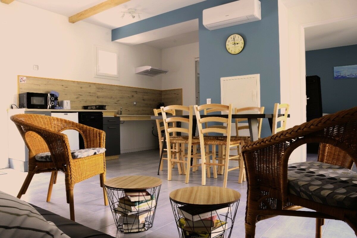 La location saisonnière se compose d'un séjour avec salle-à-manger et TV Satellite, ainsi que d'une cuisine ouverte bien équipée : cafetière Senséo, micro-ondes, réfrigérateur, lave-linge privé, lave-vaisselle, grille pain, bouilloire.