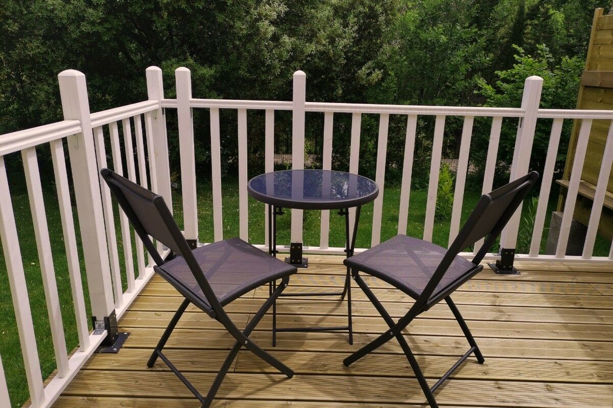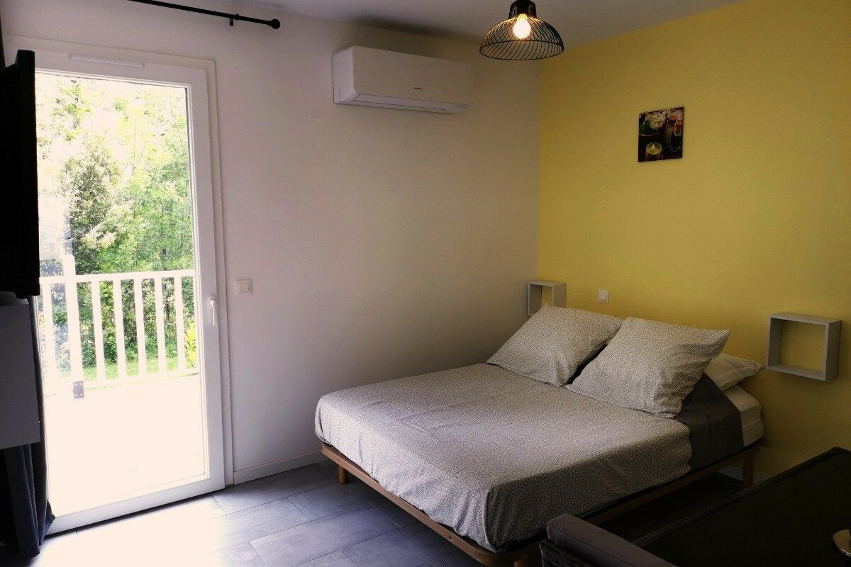 Le linge de lit et serviettes de bains fournis. Terrasse en bois sur jardin, salon de jardin. L'appartement bénéficie d'une climatisation partielle.