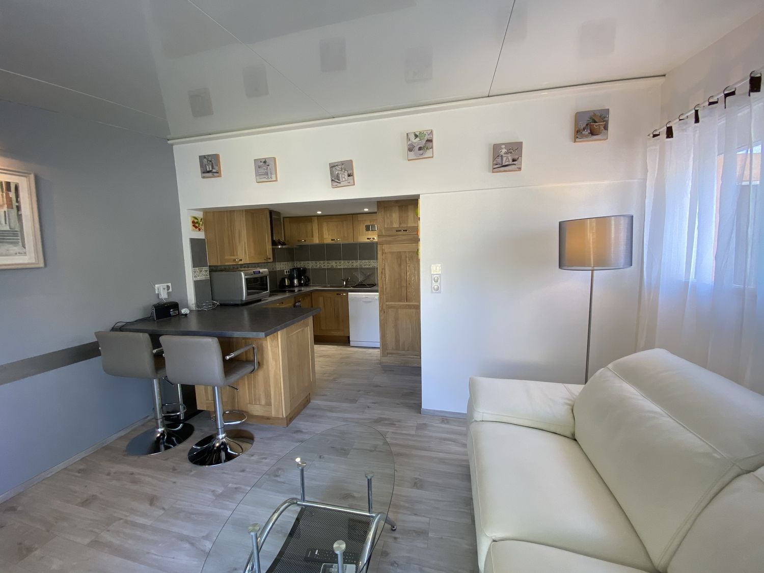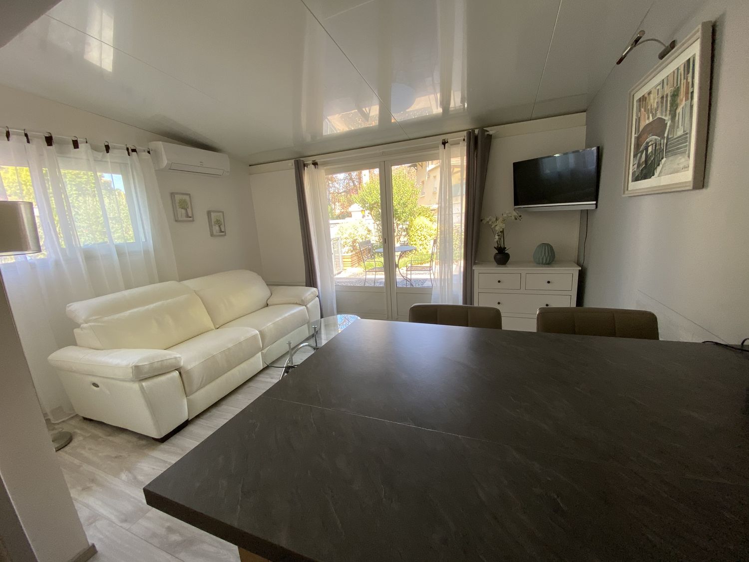 1 chambre, salon/cuisine avec climatisation, télévision, lave-vaisselle, et internet.