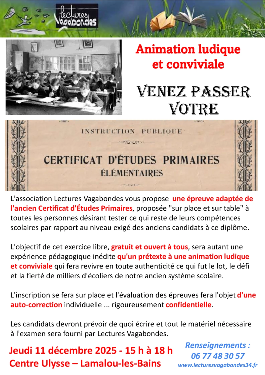 L'association Lectures Vagabondes vous propose une épreuve adaptée de l'ancien Certificat d'Études Primaires, proposée "sur place et sur table" à toutes les personnes désirant tester ce qui reste de leurs compétences scolaires par rapport au niveau exigé des anciens candidats à ce diplôme.