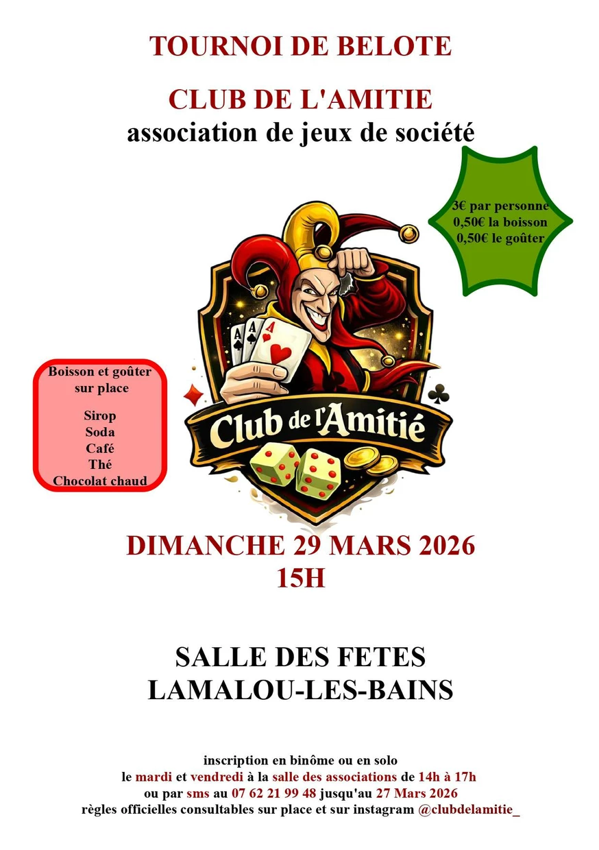 L’association lamalousienne du Club de l’Amitié vous invite à son tournoi de belote le dimanche 29 mars 2026 à 15h, à la salle des fêtes.