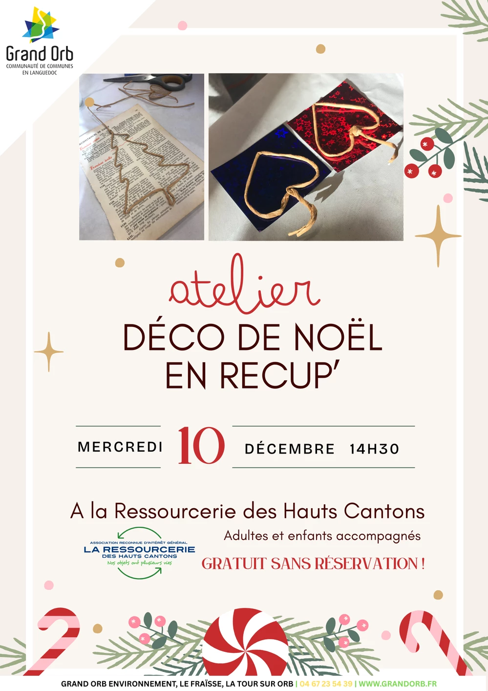 Mercredi 10 décembre à partir de 14h30, Marie et Nathalie de Grand Orb Environnement seront à la ressourcerie des Hauts Cantons pour fabriquer AVEC VOUS vos décos de Noël. L’équipe de la ressourcerie vous prépare plein de matériaux récupérés sur place que vous utiliserez ensemble… Sympa, le concept !