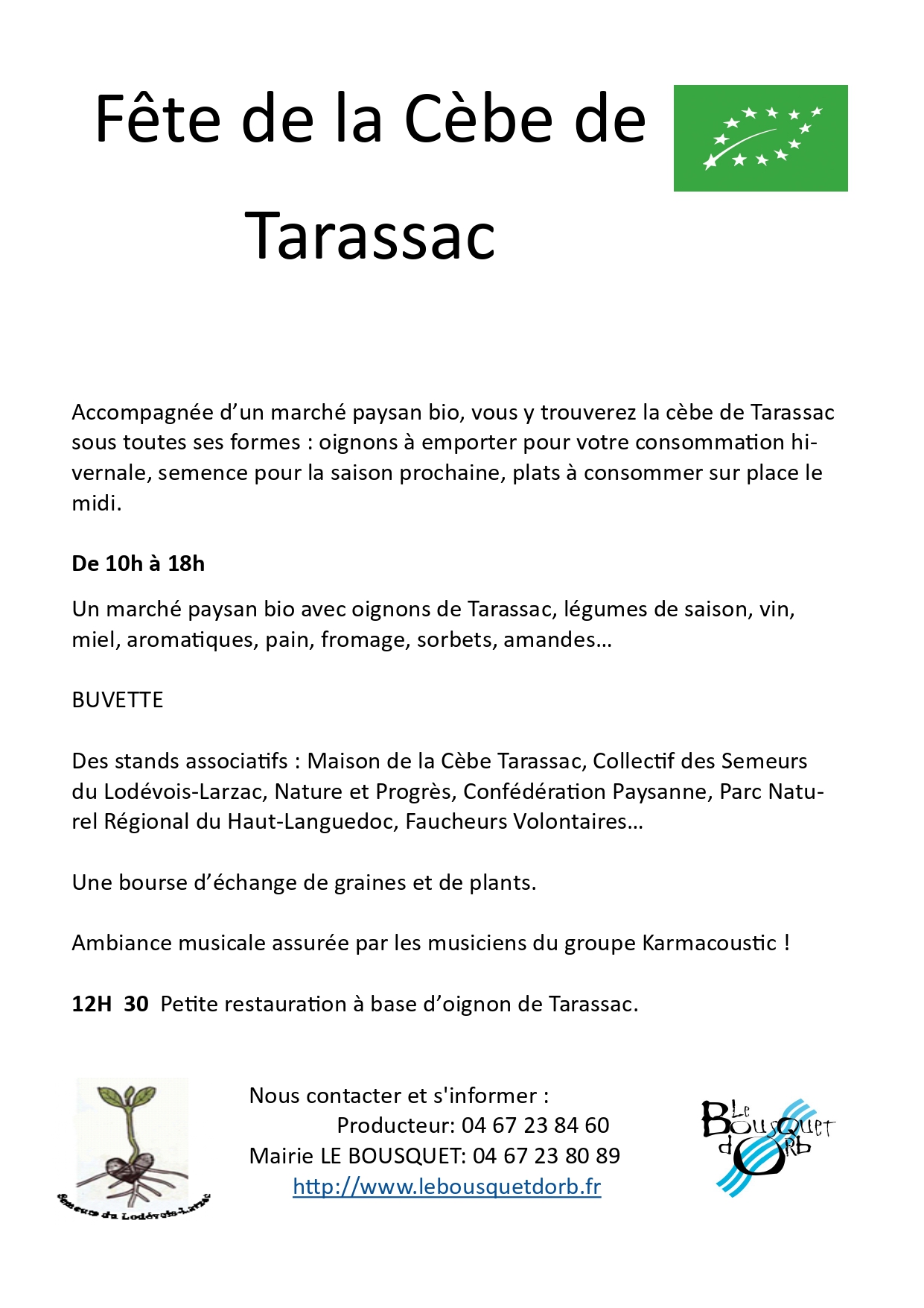 De 10h à 18h, un marché paysan bio rassemblera producteurs et artisans locaux : oignons de Tarassac sous toutes leurs formes (à emporter, semences, plats cuisinés), mais aussi légumes de saison, vins, fromages, pain, miel, sorbets, amandes et bien d’autres gourmandises.