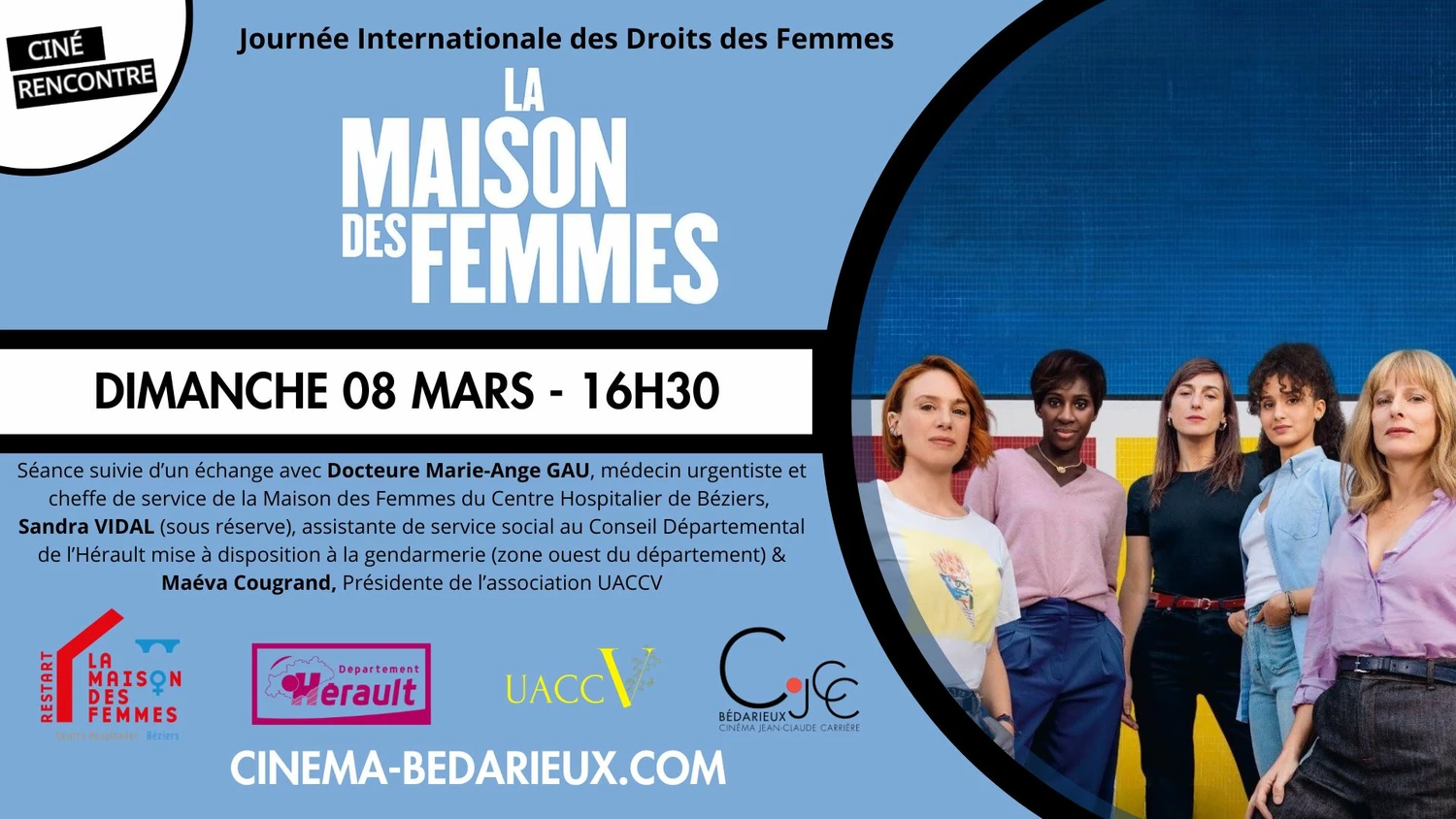 Dans le cadre de la Journée Internationale des Droits des Femmes, le cinéma Jean-Claude Carrière organise une séance « Ciné-Rencontre » le dimanche 8 mars à 16h30 autour du film « La Maison des Femmes ». La séance sera suivie d'un échange avec différentes intervenantes :