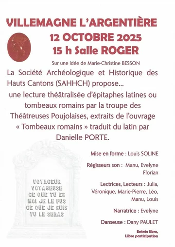 Lecture d'épitaphes latines ou de tombeaux romains par Les Théâtreuses poujolaises à 15h à la salle Roger. Danseuse Dany Paulet.