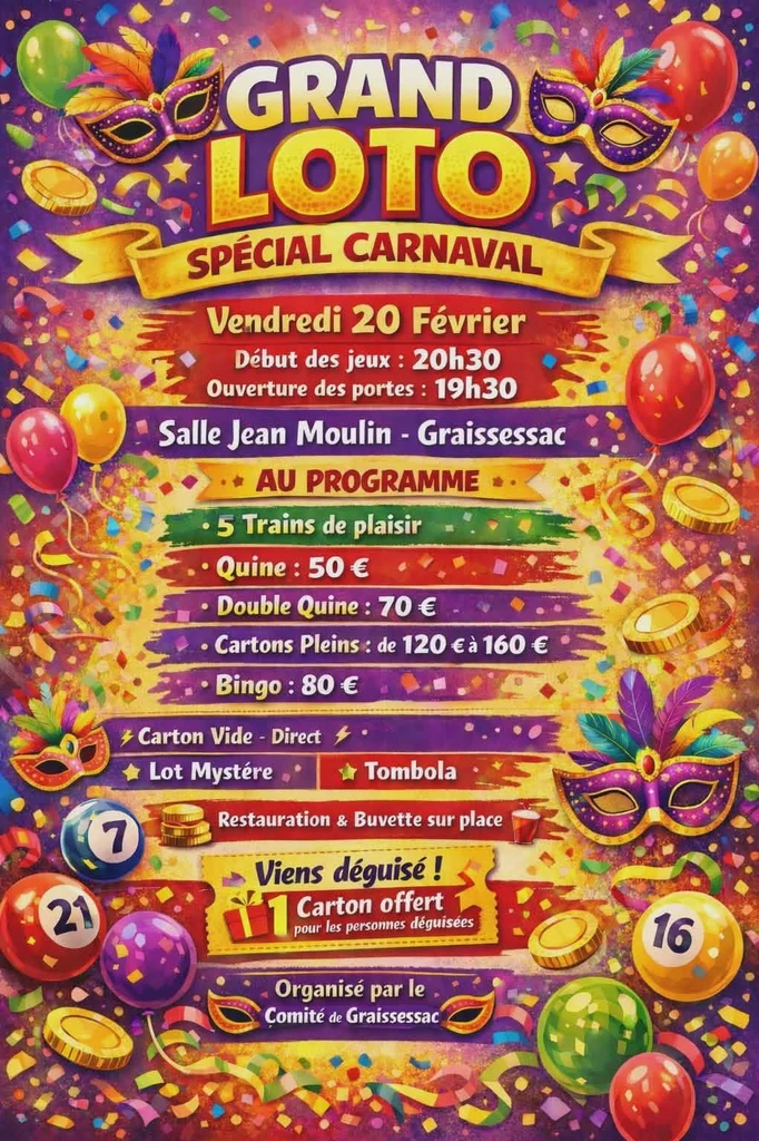 vendredi20févr. 2026Grand loto spécial carnaval organisé par le Comité des fêtes de Graissessac à la salle Jean Moulin.