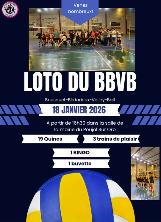 Loto organisé par le club de volley-ball Bédarieux Le Bousquet d'Orb à 16h30 à la salle des fêtes municipale du Poujol-sur-Orb.