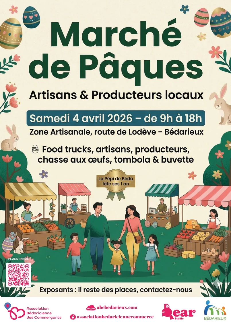 L’Association Bédaricienne des Commerçants, en partenariat avec La Pépi de Béda, vous invite à un grand marché de Pâques des artisans et producteurs locaux pour fêter les 1 an de La Pépi, le samedi 4 avril 2026 de 9h à 18h, dans la zone artisanale, route de Lodève.