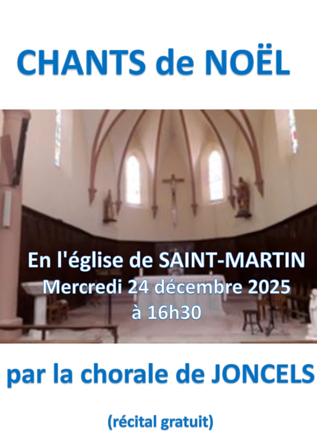 Chants de Noël en l'église de Saint-Martin (Bousquet d'Orb) le mercredi 24 décembre à 16h30.